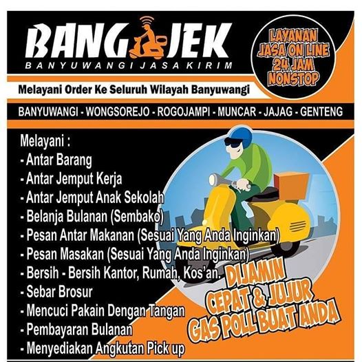 - Jasa antar barang, belanja, kirim paket/dokumen dan sebagainya dipatok Rp 7 ribu untuk tujuan kota Banyuwangi dan sekitarnya.